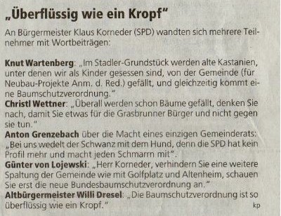 Zuletzt konnten sich die Besucher zu Wort melden. 13 Bürger nahmen die Möglichkeit wahr, stellten Fragen und äusserten ihre eigenen Meinungen bezüglich der BschV. Besonders interessant war der Hinweis von Herrn von Lojewski (Neukeferloh) auf das am 1.3.2010 in Kraft getretene Bundesnaturschutzgesetz sowie die Wortmeldung von Frau Kappelsberger (Neukeferloh), die über eigene negative Erfahrungen mit der BschV in Haar berichtete.